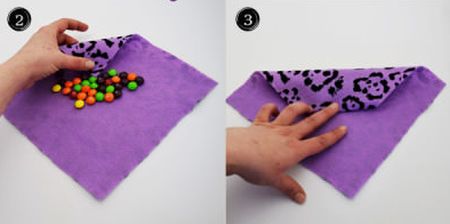 2- Risque no feltro um quadrado no tamanho que você desejar, depois recorte este quadrado de feltro e coloque as guloseimas escolhidas no meio do quadrado. Vire uma ponta do quadrado para dentro, em direção à guloseimas, e vire mais uma vez.
