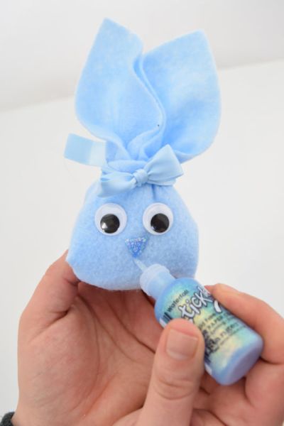 Para dar acabamento final, cole os olhos de plástico em sua peça e faça focinho e boca com a cola ou tinta com glitter. Olhem o resultado final, é lindo.