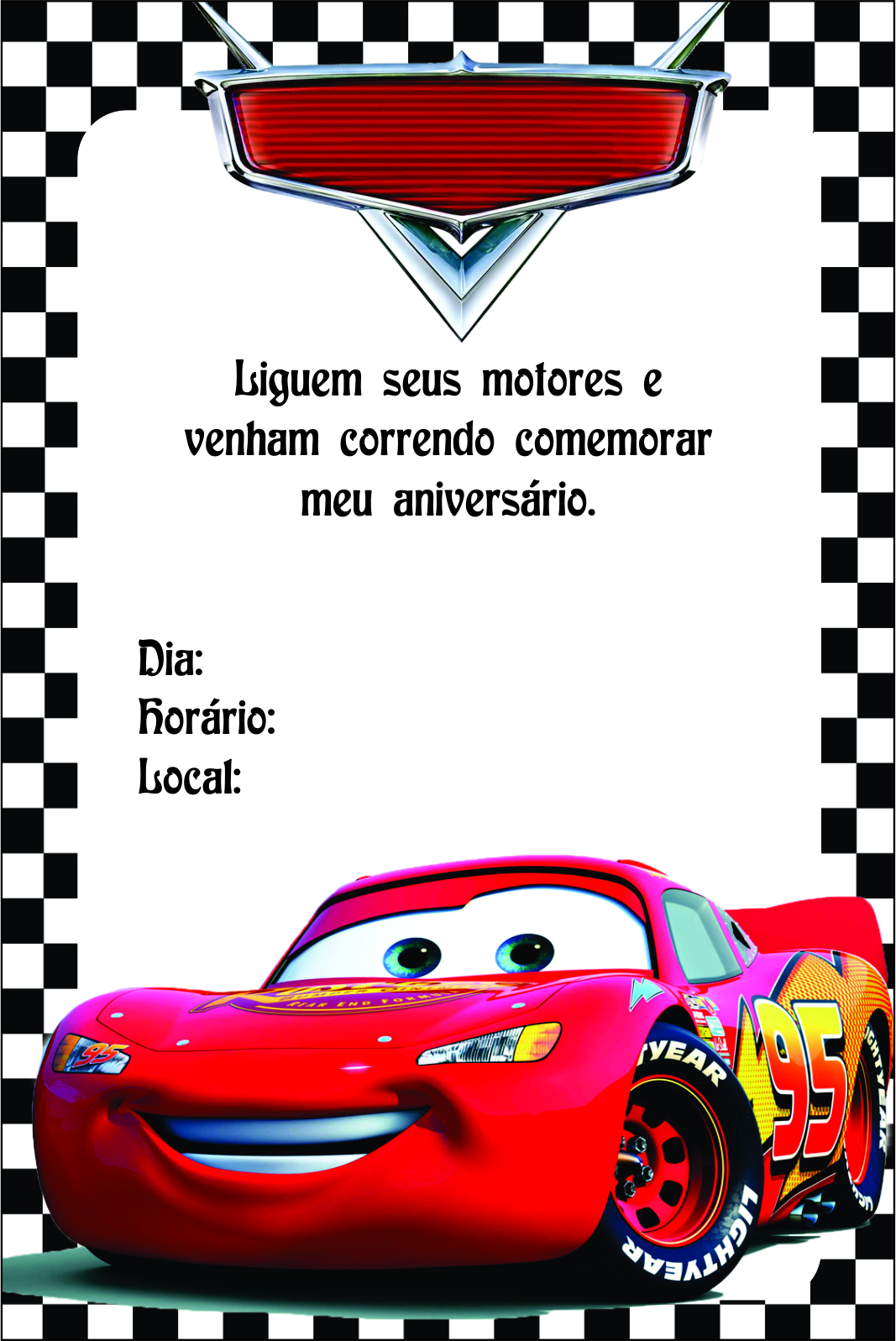 Um dos temas de aniversário infantil para menino que está em pauta, sem dúvidas é o carro da disney que é a continuação do filme e animação Aviões. Se seu filho é fascinado por este desenho com certeza ele irá amar a festinha inspirada nesta turminha afinal, que menino não fica encantado pelos personagens McQueen, Vitaly Petrov, Mate entre outros…. Portanto hoje separamos vários modelos de convites dos carros para imprimir, editar grátis, lembrando que o convite deve ser sempre entregue ao menos 40 dias antes do dia da festa para os pais se organizarem.