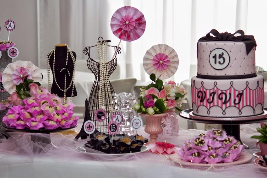 Lembre-se as cores mais usadas para este tema são: O rosa, branco e marrom; rosa e preto; rosa, marrom e dourado; vermelho, preto e dourado; rosa e azul; laranja e marrom ou preto. Um dos elementos fundamentais que não pode faltar neste tipo de evento é detalhes como: a torre Eiffel, flores, brilho, bailarinas, vidros de perfumes, moda, cão poodle, bolsa da chanel entre outros. Estes tipos de detalhes podem estar sobre o bolo, na decoração da mesa, nos docinhos, convites, lembrancinhas e até mesmo em fotografias.