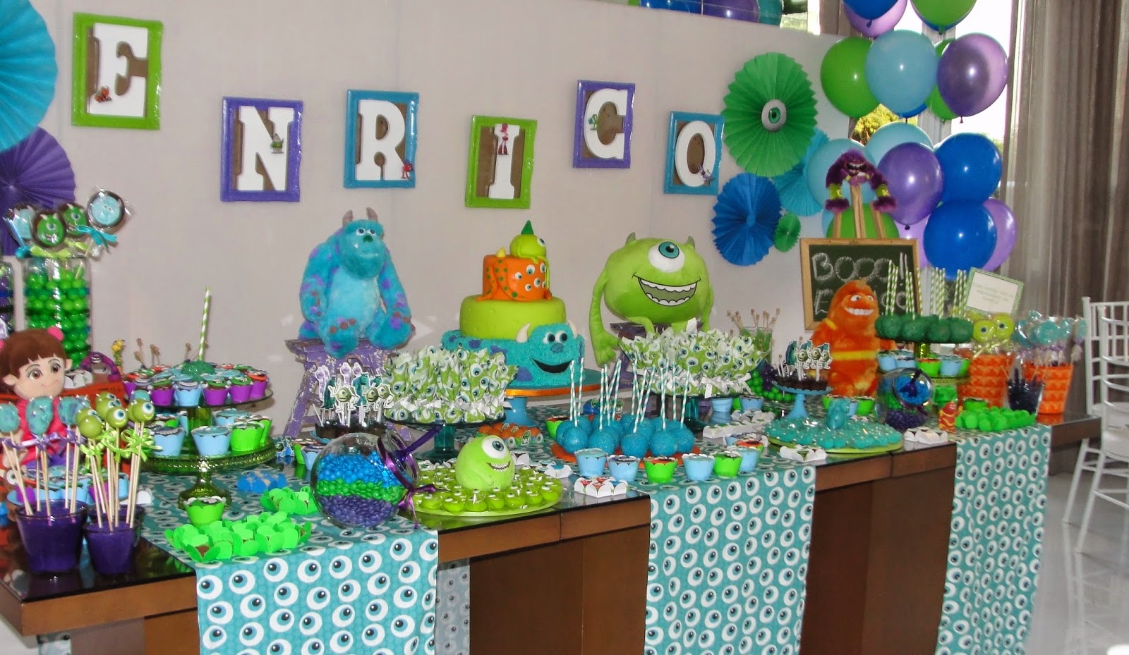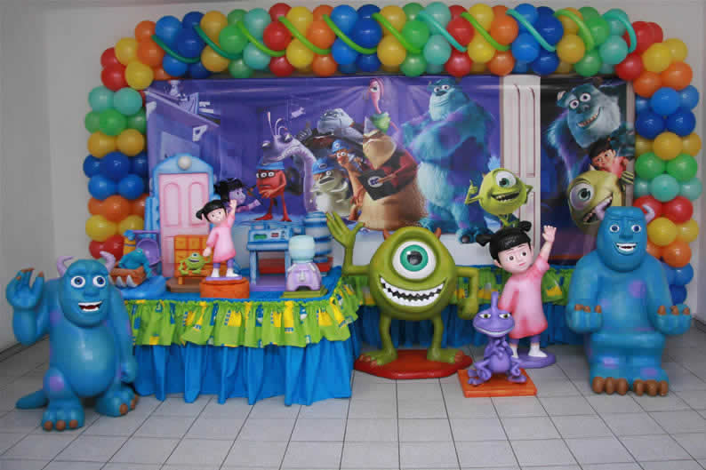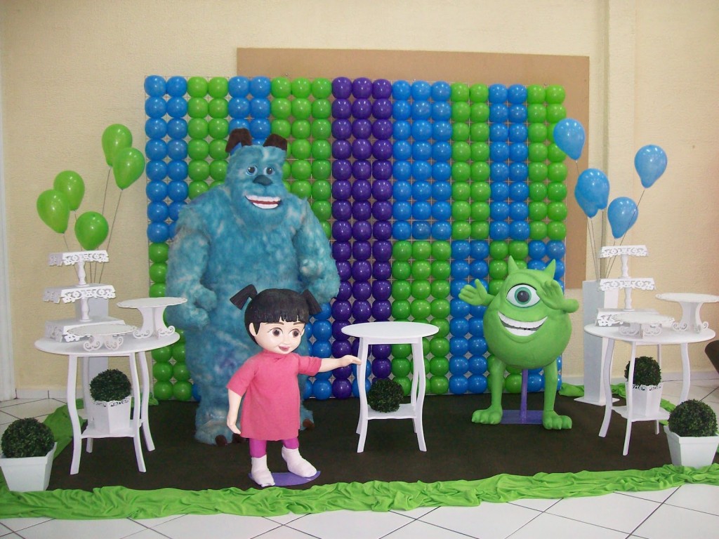 Use e abuse de bonecos dos personagens para dar um toque mais infantil a comemoração. As cores mais usadas neste tema sem dúvidas é o verde, laranja, amarelo, turquesa e roxo que apesar de serem cores mais frias quando juntadas elas ficam super alegres e descontraídas principalmente aos olhos dos pequenos que ficam encantados com tanta beleza. Os principais personagens do filme devem inspirar a decoração, ou seja, Mike, Sulley, Boo, Randall, Celia, Henry e Roz.
