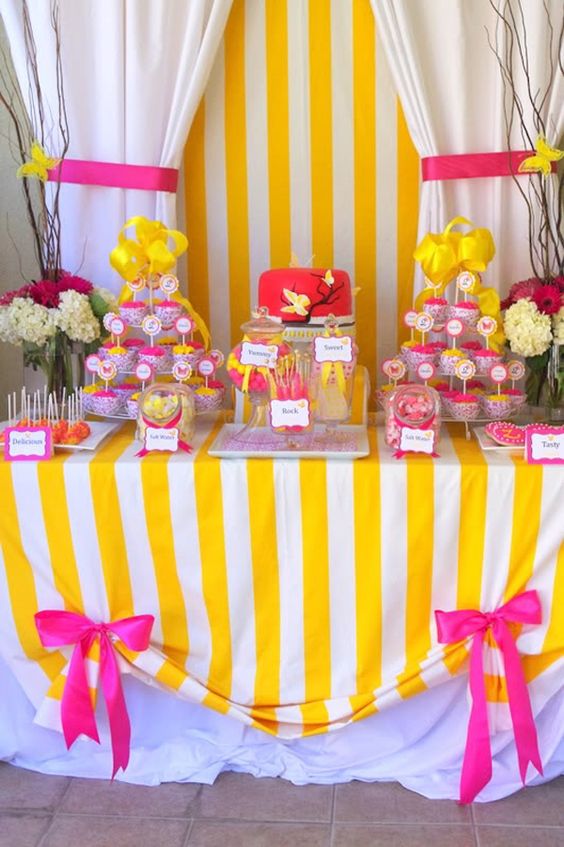 Se você é uma dessas mães que está querendo para este ano algo que seja, mais criativo e único, que tal usar a combinação de cores rosa e amarelo para decoração da festinha da sua menina? A combinação dessas cores podem te surpreender pois, juntas elas se harmonizam tornando o visual bem bonito de se olhar! Para suavizar o amarelo e o rosa você pode estar usando mesas e cadeiras nas cores brancas fica bem delicado.