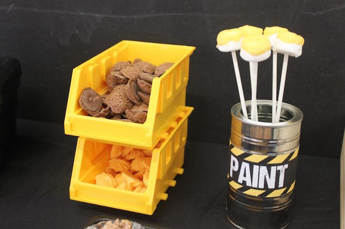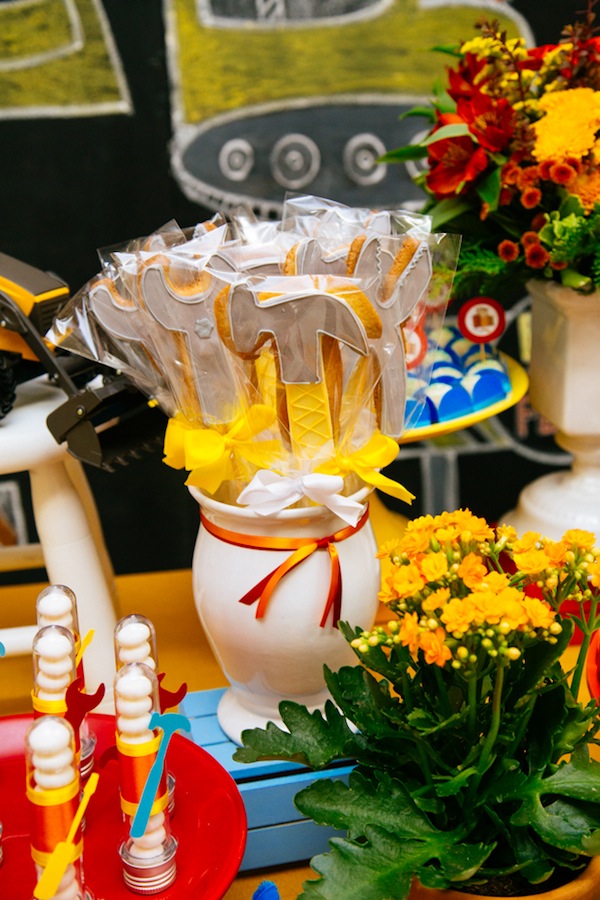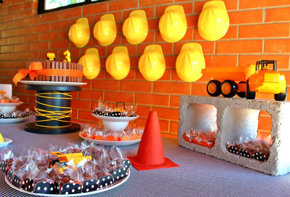 Use caçambas de caminhões de plástico para colocar bolachas, balas e suspiros este item pode ser tornar um excelente pratinho para expor as guloseias na mesa principal. Balões nas cores laranja, preto e azul ficam ótimo perto da mesa do bolo, lembre-se as lembrancinhas devem ser bem caprichadas afinal, muitas crianças esperam ansiosos pela hora da entrega. Confiram agora algumas fotos de festa infantil tema construção e mãos a obra!