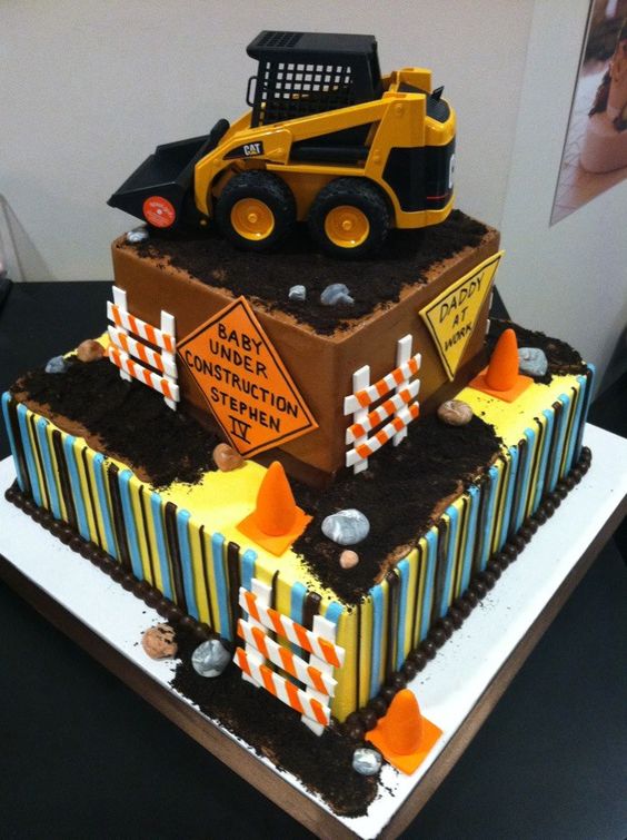 Pois, bem para deixar este dia perfeito comece escolhendo um bolo, ele pode ser personalizado ou simplesmente feito por você, acalme-se isto é possível mesmo que você não tenha tanta prática, veja o modelo acima por exemplo ele é um bolo de chocolate simples com cobertura, onde foi feito um buraco para simbolizar um barrando e colocado alguns tratorzinhos de brinquedo para tornar bolo mais real.