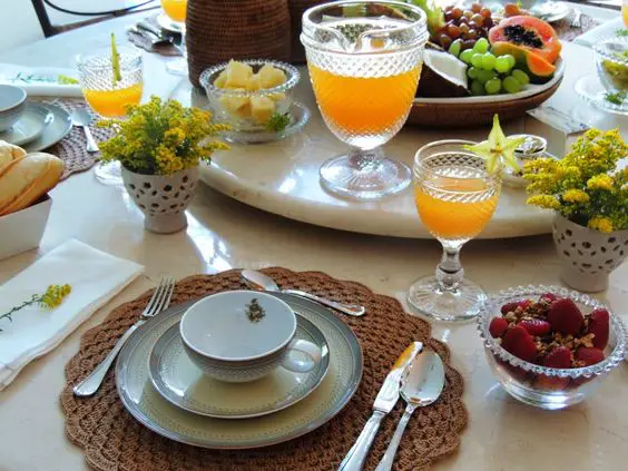 O café da manhã é algo primordial para começarmos o dia com pé direito, cheio de frutas, pãezinhos, sucos ou aquele indispensável cafezinho com leite, tomar café antes de sair para escola ou emprego te dará um gás a mais para aguentar a correria da manhã. Para que o café da manha seja, especial é necessário deixar a mesa posta com classe sim, não adianta nada ter quitutes maravilhosos se estão distribuídos de qualquer maneira sobre a mesa.