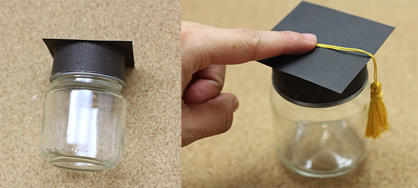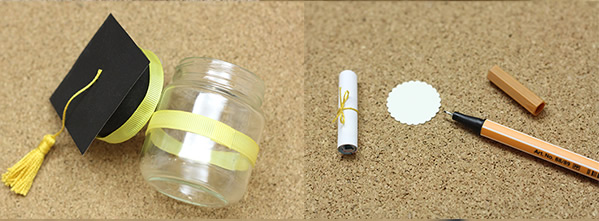 Então, cole o penduricalho no centro da tampa use, cola de silicone frio. Passe a fita amarela na borda do chapéu e na circunferência do frasco para decorá-lo e com a cartolina faça um rolinho de papel simbolizando o diploma, já no centro do pote você pode colar um circulo de papel com o seu nome escrito nele. Terminamos nossa lembrancinha de hoje, dentro do potinho você pode colocar docinhos, brigadeiros, balinhas entre, outros…