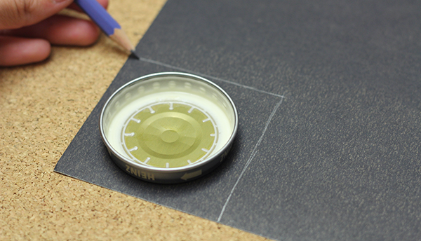Faça um desenho de um quadrado em volta da tampa do frasco com aproximadamente 1,5 cm de distância da tampa até a borda do quadrado, em todos os lados.