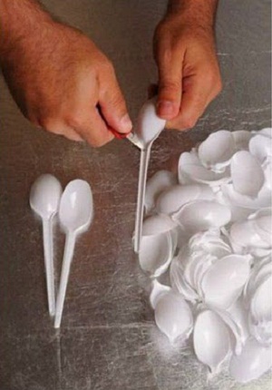 Corte os cabos das colheres utilizando faca ou tesoura como na imagem abaixo.