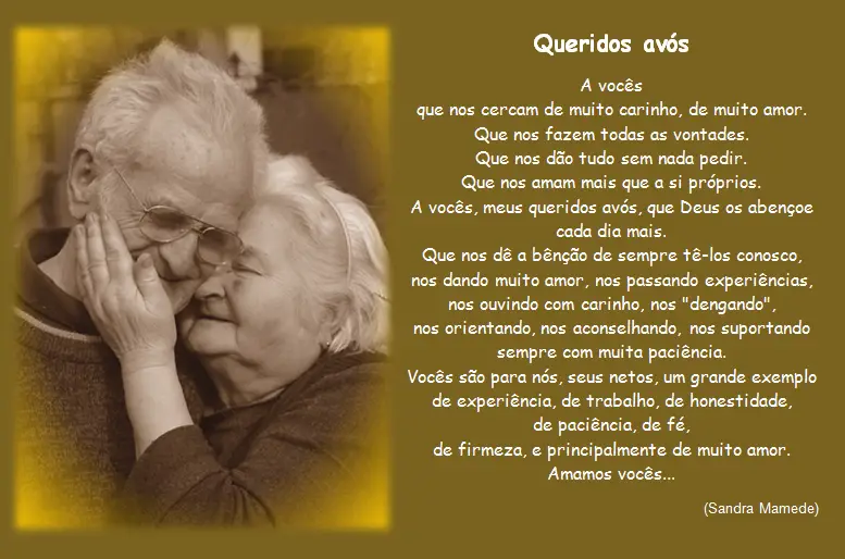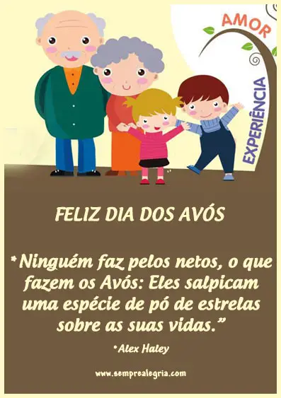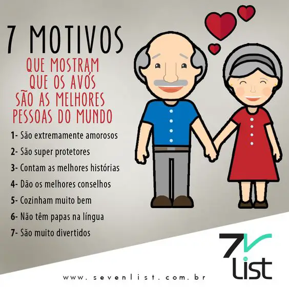 E não podemos deixar de lado os vovôs que também, são pessoas maravilhosas que fazem parte da nossa vida nós momentos difíceis e alegres sempre prontos para dar aquele melhor conselho e abraços nós momentos de indecisão. Existem várias datas comemorativas como dia das mães, dia dos pais, dia das crianças enfim, o dia 26 de julho foi escolhido como o dia em que os netos homenageiam seus velhinhos queridos agradecendo todo amor recebido.