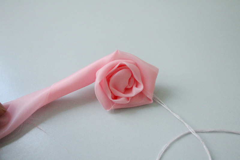Dobre o tecido ao meio e comece a enrolar, formando o miolo da rosa.